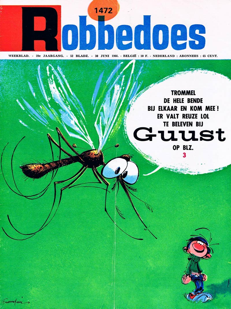 Just as chaotic as its subject, was the history of the 'Gaston' album collection series. In 1960, Éditions Dupuis released a limited print-run booklet of 8,30 x 19,60 cm (3.26 x 7.7 inch) which is now sought-after by many collectors and worth thousands of euros. The regular album series took off in 1963 with 'Gala de Gaffes' - bearing volume number 2. After volumes 3 ('Gaffes à Gogo', 1964) and 4 ('Gaffes en Gros', 1965) suddenly came volume 1 ('Gare au Gaffes', 1966) - in an attempt to create a new starting point for the ongoing series, since the 1960 booklet was out of print. It was followed by the official number 5, 'Les gaffes d'un Gars Gonflé' (1967). These first five "official" albums were all released in the landscape format, according to the feature's half-page gag format. By the time Franquin switched from half-page to full-page gags, the books got the regular Franco-Belgian portrait-shaped format, starting with volume 6 ('Des Gaffes et des Dégâts', 1968) and continuing regularly through volume 14 ('La Saga des Gaffes', 1982). By 1970, the landscape-format books (1 through 5) went out of print and were gradually replaced by regular format books, receiving a serial number starting with a letter R and a contracted title based on the original booklets. Since the large-format books allowed twice as much content as the landscape-format ones, there was only enough material to fill the albums R1 ('Gala de Gaffes à Gogo', 1970), R2 ('Le Bureau des Gaffes en Gros', 1972) and R3 ('Gare aux Gaffes du Gars Gonflé', 1973). Album R4 ('En Direct de la Gaffe', 1974) contained remaining gags and a selection of the Gaston-themed editorials by Yvan Delporte, but from then on, the official series continued with volume 6. For years, there was no official (normal format) album 5, leaving fans and collectors puzzled. The omission became known as the "Ghost Album", prompting bootleggers to jump in and release unofficial editions. In 1983, the new 'Spirou & Fantasio' artists Tome and Janry even devoted one of their short stories to the mystery of the missing 'Gaston' album 5 ('Vilain Faussaire'). Strangely enough, in 1985, Dupuis released an album 0 ('Gaffe et Gadgets'), with material from the earliest Gaston appearances in Spirou's editorial sections and the initial gags from the 1960 mini-booklet. In the following year, the official album R5 finally saw the light under the title 'Le Lourd Passé de Lagaffe' (1986), containing previously skipped material, including the Orange-Piedboeuf advertising gags.