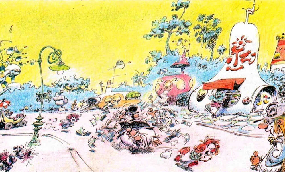 Even though he drew the series for 23 years and his stories became classics, 'Spirou et Fantasio' was a burden to Franquin. He wasn't fully at ease with the main characters, since they weren't his own creations. Never satisfied with his work and his own worst critic, the perfectionist often needed the help and support from his friends to complete his stories. Unlike most cartoonists who use assistants - especially at the time - Franquin always credited his co-workers. The plot for Franquin's first major serial, 'Il y a un Sorcier à Champignac' (1950), was suggested by Jijé's brother Henri Gillain, who used the pen name Jean Darc. Franquin's friend Georges Salmon, AKA Jo Almo, came up with the idea of 'Les Voleurs du Marsupilami' (1952). Maurice Rosy wrote the initial script for 'Le Dictateur et le Champignon' (1953-1954) and 'Les Pirates du Silence' (1955-1956), and the help of Peyo and Gos was called in to "rescue" the story 'Panade à Champignac' (1967). Franquin's most frequent script aide was Michel Greg, whose involvement started with 'Le Prisonnier du Bouddha' (1958) and lasted throughout the Zorglub cycle and 'QRN sur Bretzelburg' (1963). Franquin freely handled the provided scripts and plot ideas, often altering them in accordance with his own views. For the background art, Will helped out with the architectural design of the futuristic Incognito-City in 'Les Pirates du Silence' (1955). Starting with 'La Foire aux Gangsters' (1958), Jidéhem became Franquin's regular background assistant, who contributed to the series throughout the rest of Franquin's run.