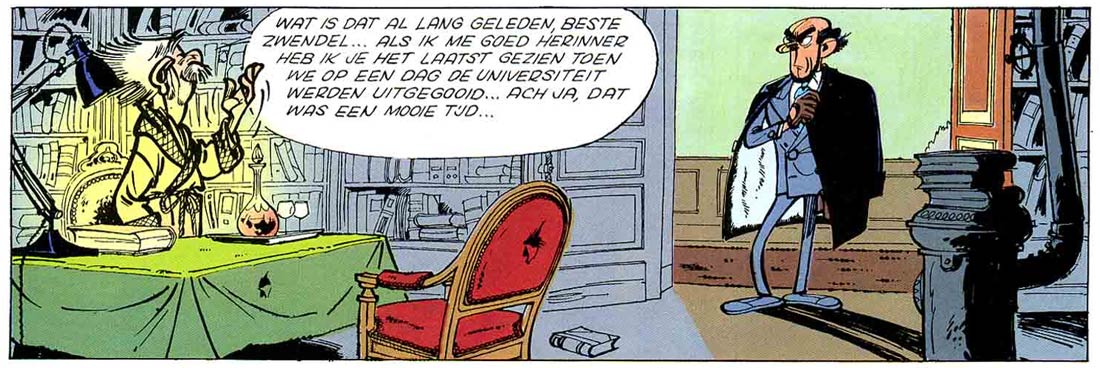 Franquin's breakout serial was 'Il y a un Sorcier à Champignac' ("There is a Sorcerer in Champignac", 1950-51), about mysterious happenings in the countryside town of Champignac-en-Cambrousse. The story marked the debut of many important secondary characters, most notably the local Count - Pacîme Hégésippe Adélard Ladislas de Champignac in full, but usually shortened to "the Count of Champignac". In his castle, the old nobleman is active as a part-time scientist, inventor and mushroom expert, often causing mayhem with his well-intended experiments. He became the series' brilliant but absent-minded professor, who accompanied Spirou and Fantasio on many of their adventures. The mushrooms from the castle garden form the basis of the count's groundbreaking inventions, like the X1 elixir that gives superhuman strength and speed, or Métomol, a pink gas that makes metal soft. These inventions are not without risk, as is seen in the short story 'La Peur au Bout du Fil' ("Fear on the End of the Line", 1959): the count accidentally overdoses on his X3 potion, which should have boosted his intellect and memory, but was turned into an evil madman. The otherwise peaceful Champignac village remained the setting of many 'Spirou et Fantasio' episodes, both by Franquin and his successors. The distinctive town inhabitants form a colorful addition to the 'Spirou' universe. Besides the Count, well-known figures are the self-important mayor Gustave Labarbe, the local chemist and drunk Dupilon and the dutiful town clerk Duplumier.