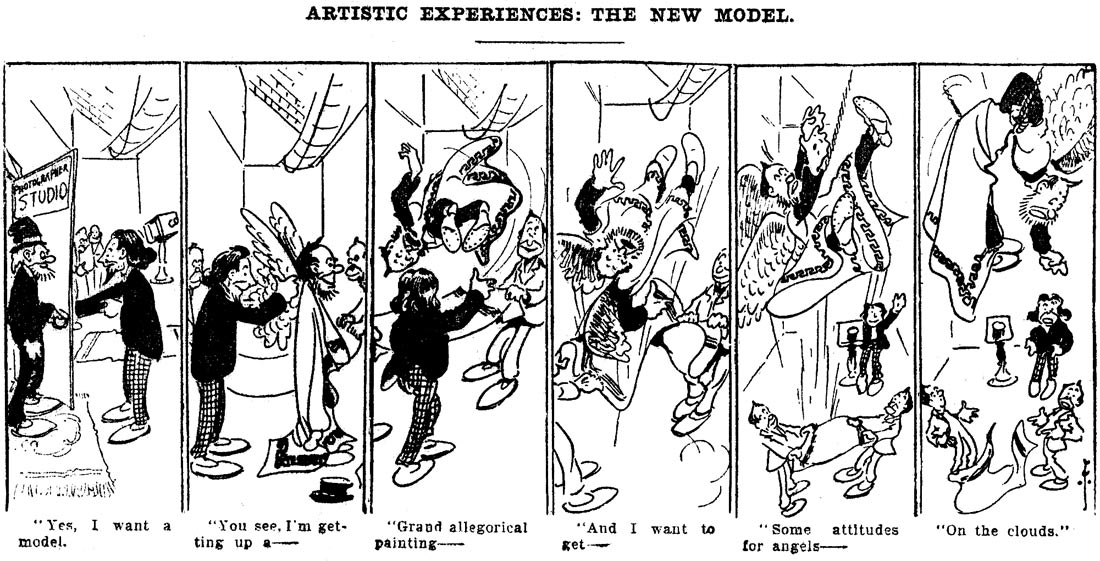 Several Daily News creations were made in alternation with fellow staff artist R.B. Fuller, such as 'Poor Uncle!' (24 October 1907-2 December 1911), 'Seeing The Ball Game' (1 June 1908-13 September 1910), 'The Town Blowhard' (28 January 1909-31 January 1912), 'His Frightful Nerve' (AKA 'His Awful Nerve', 16 February 1909-28 December 1910), 'Laughing It Off' (7 September 1909-16 August 1911) and 'The Humorous Yeggman' (15 January 1909-21 July 1911). Also filling in on several of these strips was Richard Thain. Fuller and Thain were also regular fill-in cartoonists for George Frink's longer-running features, 'Sammy Spankem' (1908-1913) and 'Getting Wise' (1909-1915).