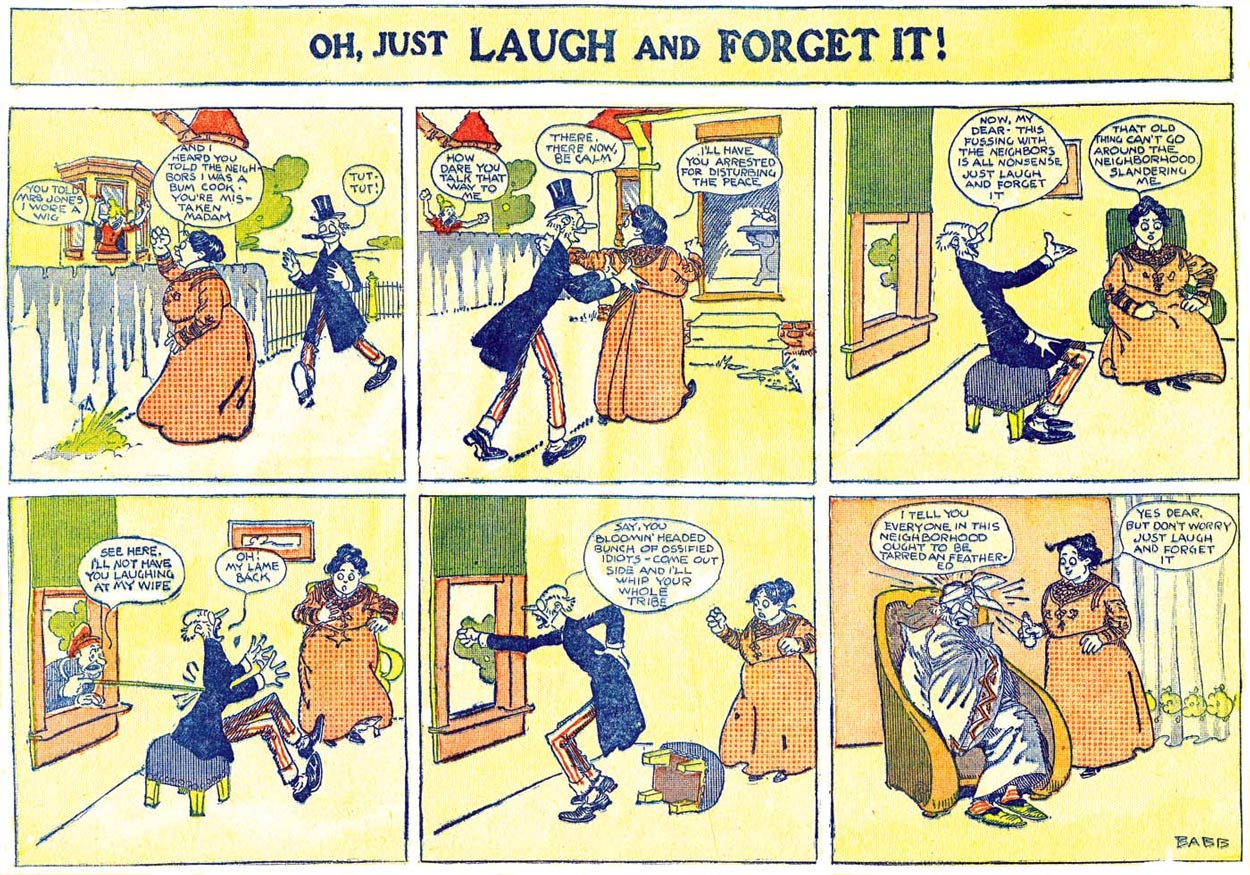 In 1910, Frink additionally joined the World Color Printing syndicate, creating new features like 'The Picture Show' (28 August-25 December 1910) and 'Oh Just Laugh And Forget It' (8 May - 25 September 1910, signing with "Binks" and "Babb"), before rebooting 'Circus Solly' as 'Slim Jim and the Force'.