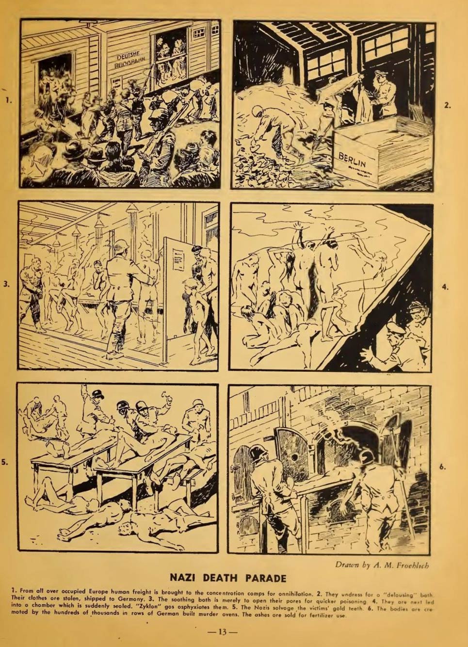 Outside of the comic book industry, August Froehlich used the sequential art form for other assignments. The most notable was 'Nazi Death Parade', a six-panel comic page detailing the atrocities of the Holocaust. It shows Jewish prisoners arriving in the Majdanek concentration camp in the south of Poland, having to give up their belongings, and being sent to showers, which turn out to be gas chambers. The German soldiers then steal their victims' golden teeth and burn the bodies. Froehlich's graphic visualization was based on eyewitness accounts documented by a Russian journalist after the July 1944 liberation of Majdanek - the first major concentration camp liberated by Allied forces. At the time, the general public knew little to nothing about the full extent of the Nazi horrors that happened in the camps. With no photographs or film material available yet, Froehlich's comic was the first known visual account of the systematic execution of the Jewish people. Created in late 1944 - before the liberation of Auschwitz - 'Nazi Death Parade' was part of the fifty-page political pamphlet 'The Bloody Record of Nazi Atrocities', that was available in New York bookstores in early 1945 to justify the American war effort. Froehlich's work then faded into obscurity, until September 2021, when the Dutch historian and Holocaust researcher Kees Ribbens discovered it, saw its historical value and brought it back to the public attention.