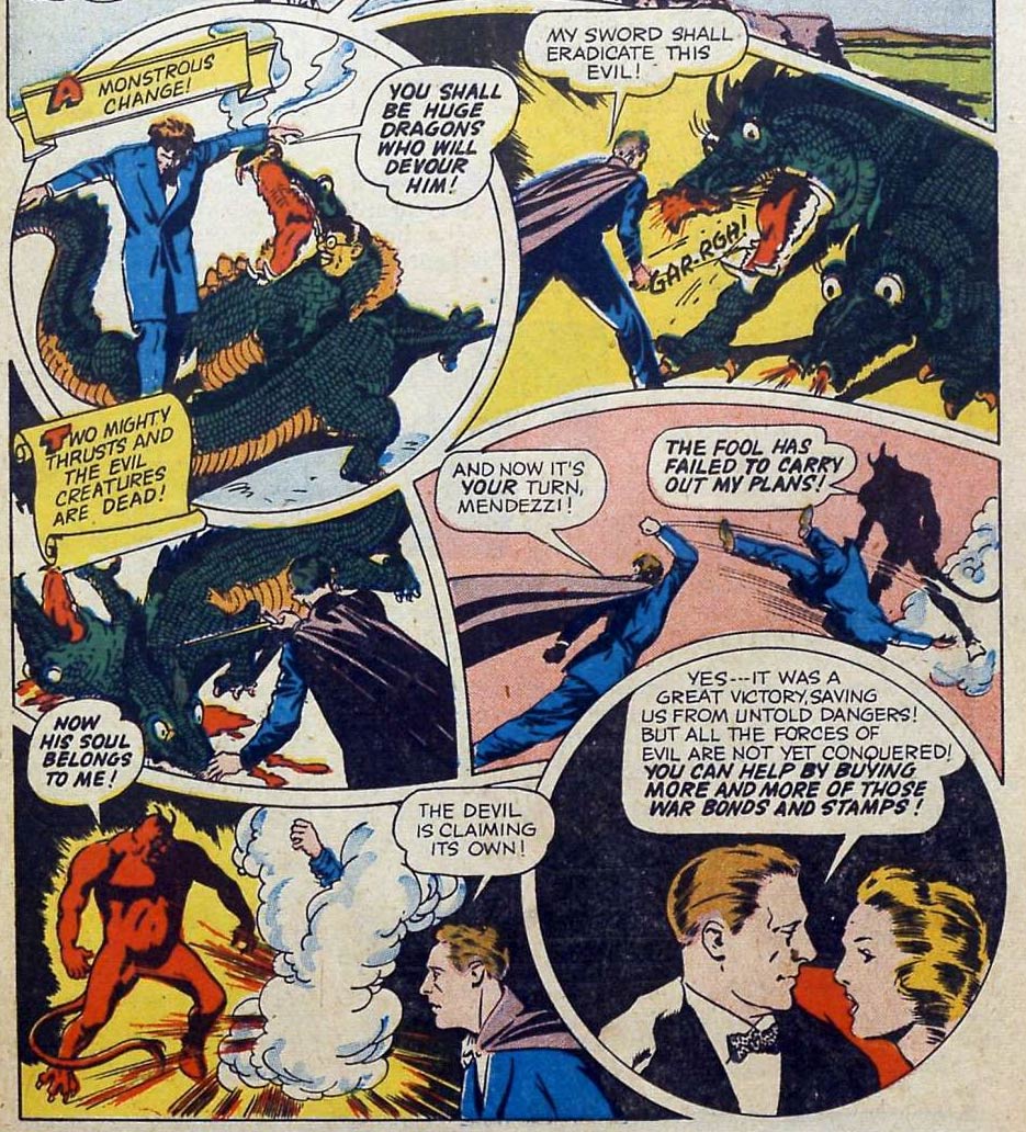 He landed more regular jobs in the comic books published by Ned Pines, starting with the feature 'The Ghost, Master Magician' in Thrilling Comics (1940-1946), about an occult investigator with the mystical powers of levitation, astral projection and invisibility. For Startling Comics, he drew the adventures of the jungle trapper 'Biff Powers' (1941-1942), and in Real-Life Comics, he made comic biographies of many historical characters (1941-1948).