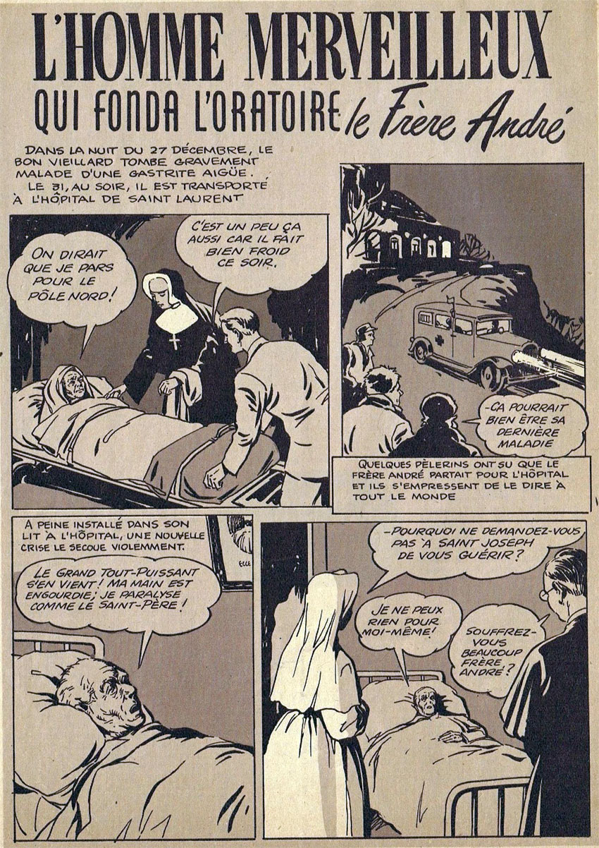 Starting in June 1952, Gagnier and writer Marcel Plamondon appeared in the magazine L'Oratoire with the Roman Catholic propaganda comic 'Le Frère André', about "Brother André" (Alfred Bessette), a doorkeeper and sacristan at Notre-Dame College in Montreal, known for his deep faith and humility. Three decades later, between 26 November 1989 and 28 January 1990, the life of Frère André was adapted into a comic strip again for the newspaper La Presse, scripted by Toufik Ehm and drawn by Zoran Vanjaka.