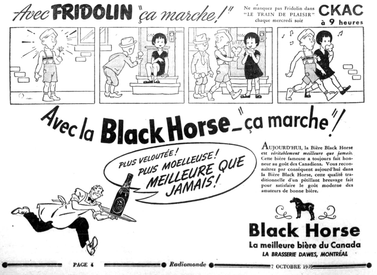 Between 1939 and 1942, Gagnier made cartoons and caricatures for the magazine Radiomonde. A regular character he drew in cartoons, illustrations and comic strips was 'Fridolin', Gratien Gélinas' stage persona of a street-smart teenager from Montréal, dressed in tri-color Canadiens hockey jersey, short trousers with suspenders and knee socks. After appearing as similar characters in monologues and a 1937 film, Gélinas finetuned the character in the radio show 'Le Carrousel de la Gaieté'. Between 1938 and 1946, Grélinas performed his 'Fridolinons' comedy stage shows, boosting the character to great popularity. In addition to drawing the comic strip, Jacques Gagnier also designed posters for these shows.