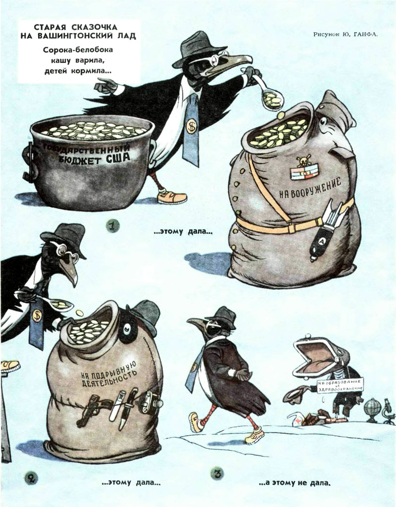 The 10 February 1953 issue of Krokodil magazine ran a Ganf cartoon titled 'In America - At This Restaurant Only One Person Is Served'. It shows a restaurant where waiters serve piles of money to a soldier, labeled "War". Judging from the types of money they serve, the four waiters represent four Western countries. The man with the knife slices U.S. dollars, hinting that he is an American, perhaps former U.S. President Harry S. Truman (who was already succeeded by Dwight D. Eisenhower by the time this cartoon was printed in Krokodil). The obese man with monocle serves British pounds and could either be then-Prime Minister Winston Churchill or the British national personification John Bull. The man with a whole plate with money, decorated with smelly cheese, is a Frenchman, possibly French Prime Minister Antoine Pinay. The wrinkly green man with swastika badge is West German chancellor Konrad Adenauer (who ironically was active in the German resistance movement during World War II). While 'War' is fed with delicious Western financial nutrition, four other customers wait in vain for service. Their tables are labeled 'Education', 'Health Care', 'Libraries' and 'Art'...