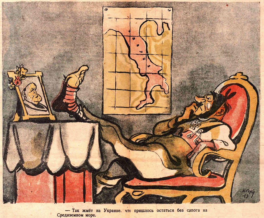"Left without a boot" (Krokodil #32, 1943). Cartoon depicting Adolf Hitler after the Allied Forces had invaded and conquered Italy in 1943, leaving Hitler without the help of one of his Axis Forces. A portrait of deposed dictator Benito Mussolini appears on the left.