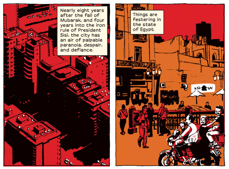 In 2014 Donia Maher wrote 'The Apartment in Bab El-Louk', which falls somewhat in the middle between a picture book and a comic. Most chapters are illustrated by Ganzeer, but the final nine pages - all dialogue - are presented in the style of a comic book, drawn by Ahmed Nady. The text itself isn't a real "story" either, it's more comparable to reflective poetry. Nevertheless it still won the Mahmoud Kahil Award for "Best Graphic Novel".