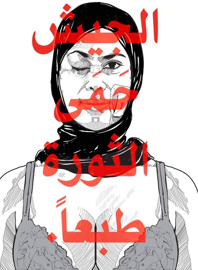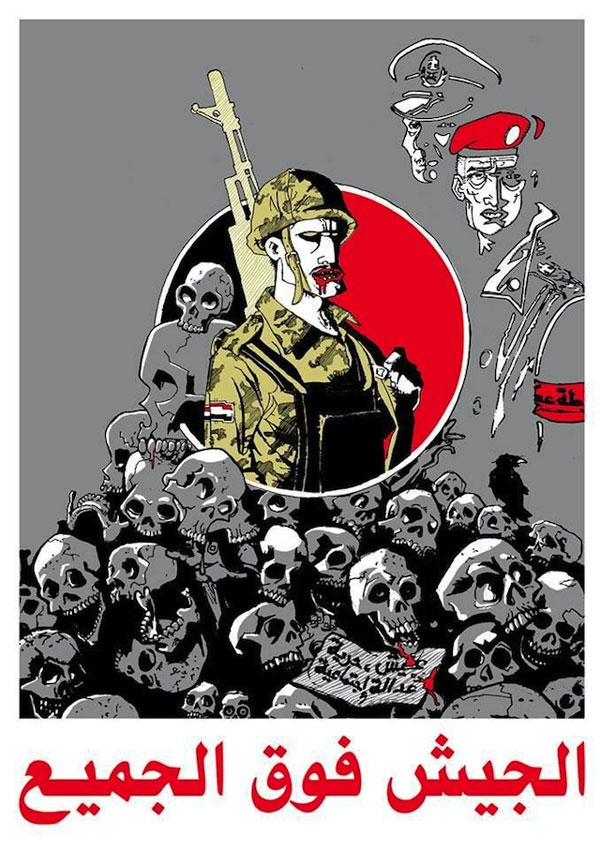 When Mohammed Morsi became president of Egypt in 2012, Ganzeer painted a highly provocative image of a nude woman in a hijab, praying for her husband to give her oral gratification. His political satire increased when Morsi was ousted in a 2013 coup by Minister of Defense Abdel Fattah el-Sisi who put himself forward as presidential candidate for the upcoming 2014 elections. Ganzeer and a group of like-minded artists started the media project #SisiWarCrimes to protest his candidacy. The mural painting 'The Army Above All', depicts a zombie soldier standing atop a pile of skulls. Another cartoon depicted Sisi in military uniform with a TV screen instead of a face, displaying a picture of a nervous rabbit muttering: "Who's afraid of art?". The cartoons were widespread, making Sisi's allies quite nervous. On 9 May 2014, in a broadcast of 'Al-Raees Wel Nas' ('The President and the People'), host Osama Kamal claimed that Ganzeer "had been recruited by the Muslim Brotherhood", despite having no proof for these claims. He called for immediate government action. Two days later Ganzeer fled his home country. It wasn't a paranoid move, because Sisi was elected president on 26-28 May, with an absurdly high amount of votes. In the final week of June 2014 another graffiti artist, Hisham Riszk, went missing. A week later, on 4 July, his drowned body was found in the Nile.