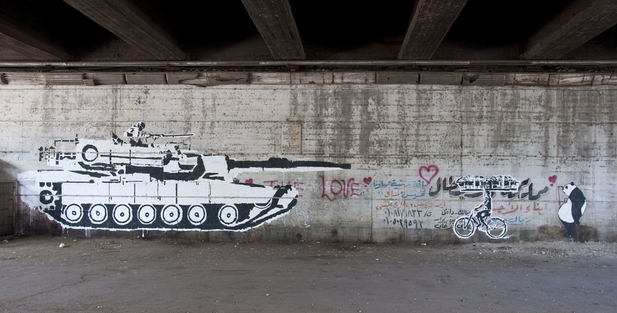 In 2011 many countries in North Africa and the Middle East experienced revolutions, dubbed the "Arab Spring" in the press. In Tunisia, Libya, Yemen and Egypt entire governments were toppled after years of oppression. Egyptian president Hosni Mubarak was forced to abdicate, but not after a long violent struggle to maintain his power. In the midst of these events, on 25 January 2011 to be precise, Ganzeer became a politically conscious artist. He and his fellow artistic friends - people like El Teneen, Adham Bakry, Mohamed Hassan and Abdullah Ragab - started creating mural paintings, posters and stickers which criticized the government and paid homage to the victims of the regime. While British graffiti artist Banksy was an important inspiration, Ganzeer has always stressed that they weren't interested in artistic self-expression, but with voicing protest and the opinion of the man in the street. On the same token he dismisses the moniker "street artist" to describe his artistic profession, because graffiti is just one of several outlets he uses. In his opinion he is a self-described "contingency artist" - one who uses whatever means necessary to create his work and message.