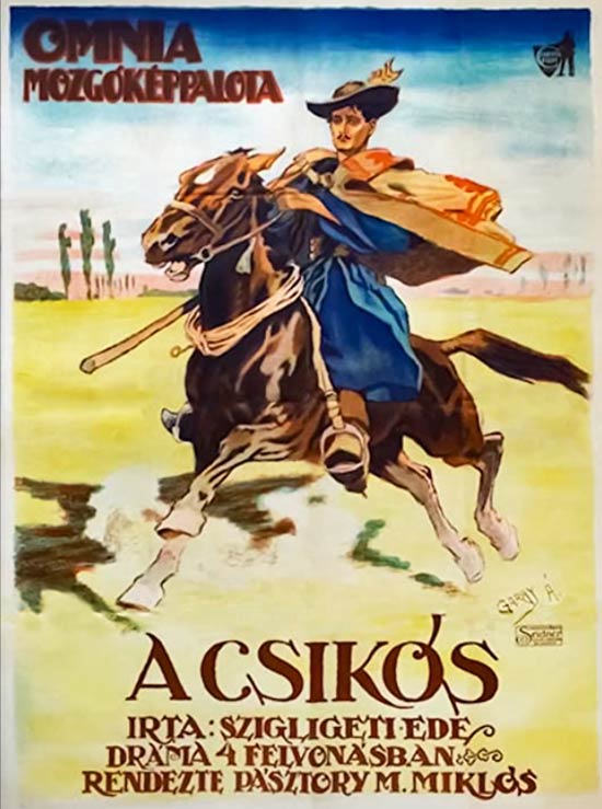 Ákos Garay was well-known in his home country for his depictions of Hungarian folk life, hussars and horsemen; both in his paintings and in a series of posters for Printing Company Kner. He also designed the movie posters for the Hungarian films like 'A Csikós' (1917), 'Tábor', 'Félszüzek' (1924), 'Horthy Miklós azt üzente' (1939) and 'Homunkulusz'.