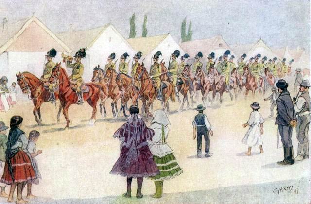 During the First World War, Ákos Garay served with the Vilmos Hussar Regiment as a military painter. In commission of the Sajtóhadiszállás "press headquarters", he made over 100 paintings and drawings of battlefields and other war scenes, appearing on propaganda postcards. Even though he was too old to actively participate in World War II, he still illustrated front battles for postcards.
