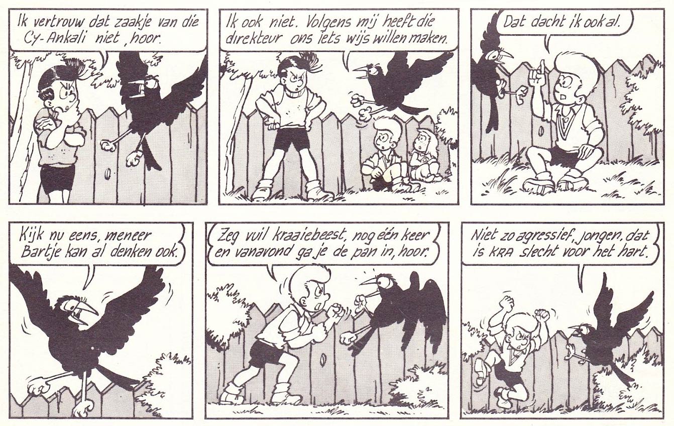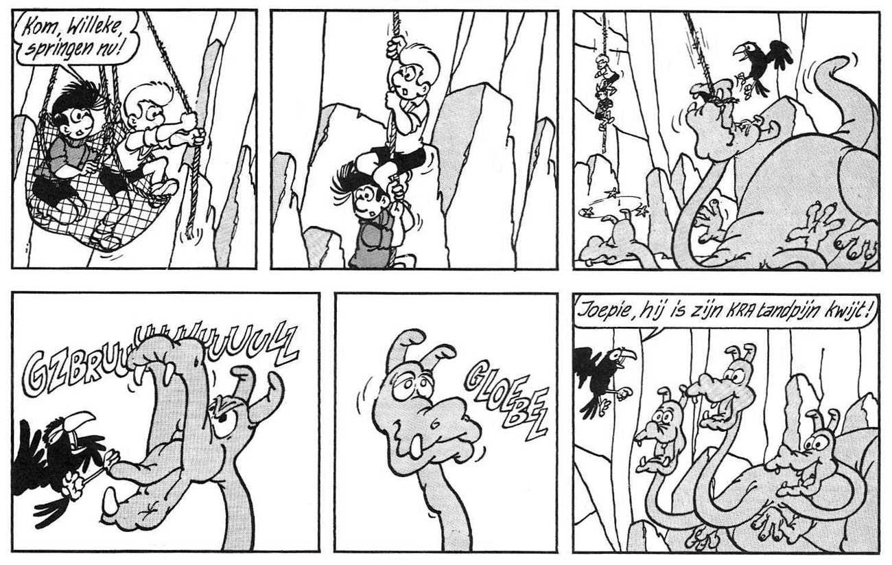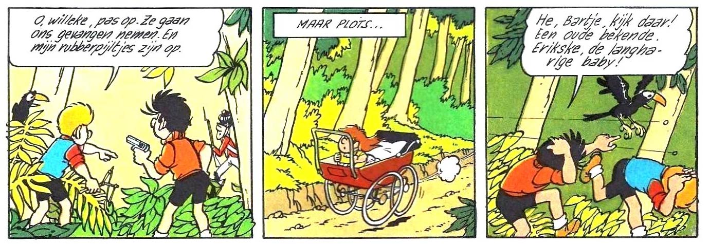 However, 'Willeke' caught the eye of Gastmans' former employer Jef Nys, who felt that the graphic style, lay-out, typography, poses and dialogues looked suspiciously similar to his 'Jommeke' comic. In many ways, the main characters were direct copies of his own cast members. Like Jommeke, Willeke is a blond boy. His black-haired sidekick Bartje is similar to Jommeke's friend Filiberke. Willeke even owns a talking bird, much like Jommeke's parrot Flip. The only difference is that Bartje's pet is a crow, whose ability to talk makes far less sense compared with a parrot. The recurring villains Brol and Krol are rip-offs of the Nys scoundrels Kwak and Boemel. Much to Nys' irritation, the artwork was far better executed than what Gastmans had created when he worked at his studio. The plots were stories Gastmans had once suggested for 'Jommeke', but which Nys had rejected.
