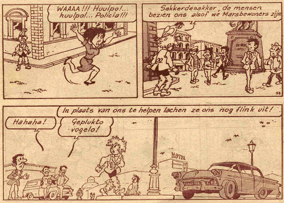 Jommeke - 'De Fwietmachine'. Filiberke and Flip look different here, because they changed appearance through a failed laboratory experiment by professor Gobelijn. However, the proportionless and stylistically different background characters have no such excuse.