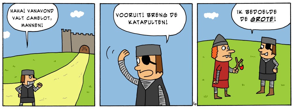 'De Rosse Ridder'. Translation: "Haha, tonight Camelot will fall, men! C'mon! Bring the catapults! I meant the BIG one!".