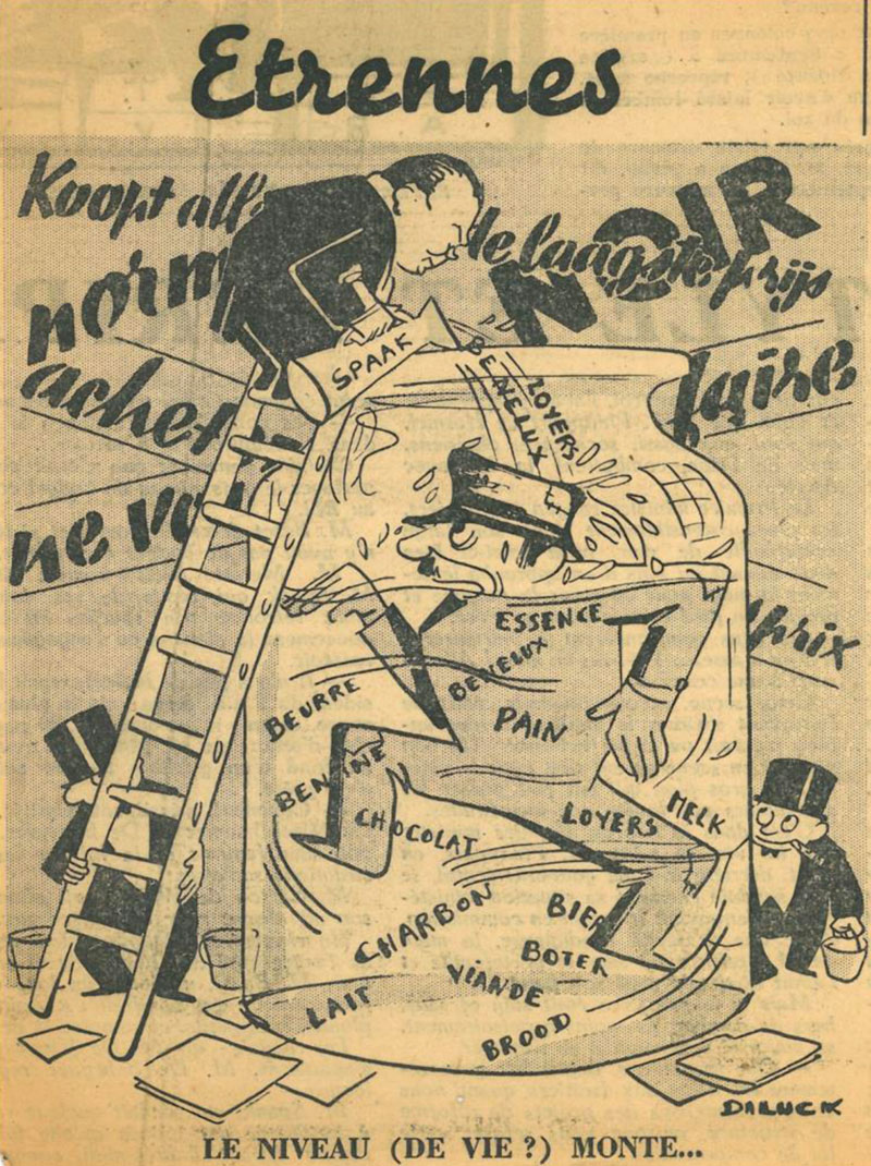 Cartoon criticizing socialist Prime Minister Paul-Henri Spaak's economic policy, which inundates the common man, while "the living standards are rising."