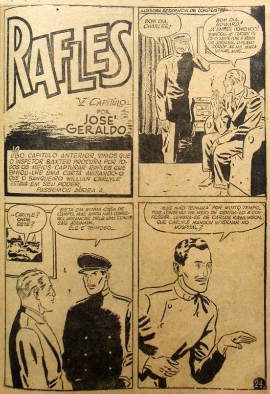 In 1945, O Guri published Geraldo's comic strips based on the German pulp series 'Raffles' by Kurt Matull and Theo Blakensee. The series deals with a notorious Victorian era gentleman thief, who is actually the nobleman Lord Lister. However, the comic strip was printed under the misspelled title 'Rafles'. Among the other early contributors to O Guri were the journalist/cartoonist Millôr Fernandes, the Portuguese artist Arcindo Madeira and Péricles with his character 'Oliveira, o Trapalhão'.