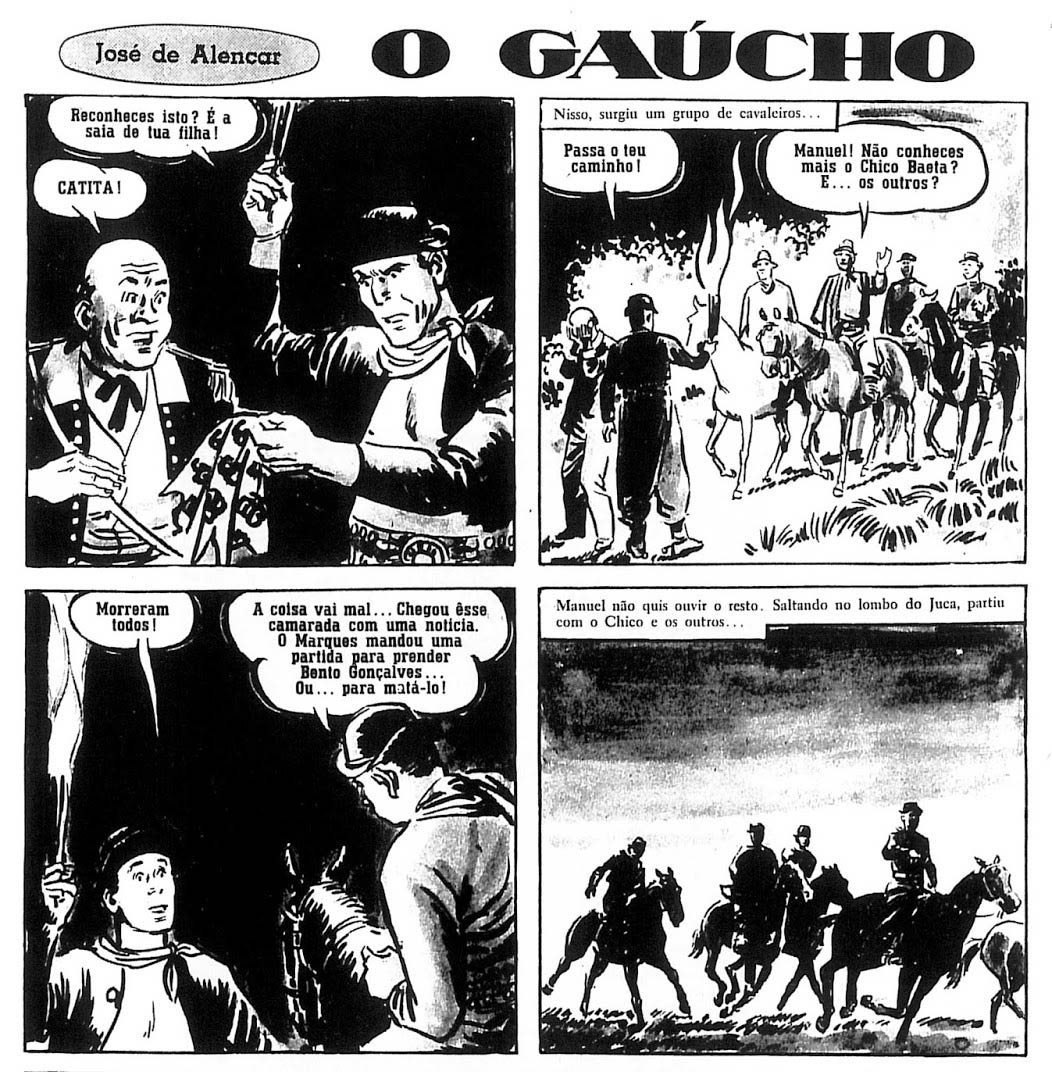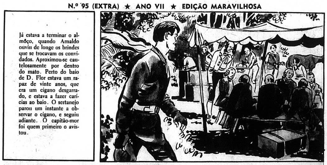 For the series 'Edição Maravilhosa' by EBAL, Géraldo illustrated adaptations of 'O Gaúcho' (#83, 1954), 'O Sertanejo' (#95, 1954) and 'Senhora' (#120, 1956), all novels by Brazilian Romantic novelist José de Alencar. The series can be seen as the Brazilian version of the US 'Classics Illustrated' comic books by Gilberton. The cover illustrations were by Antônio Euzébio.