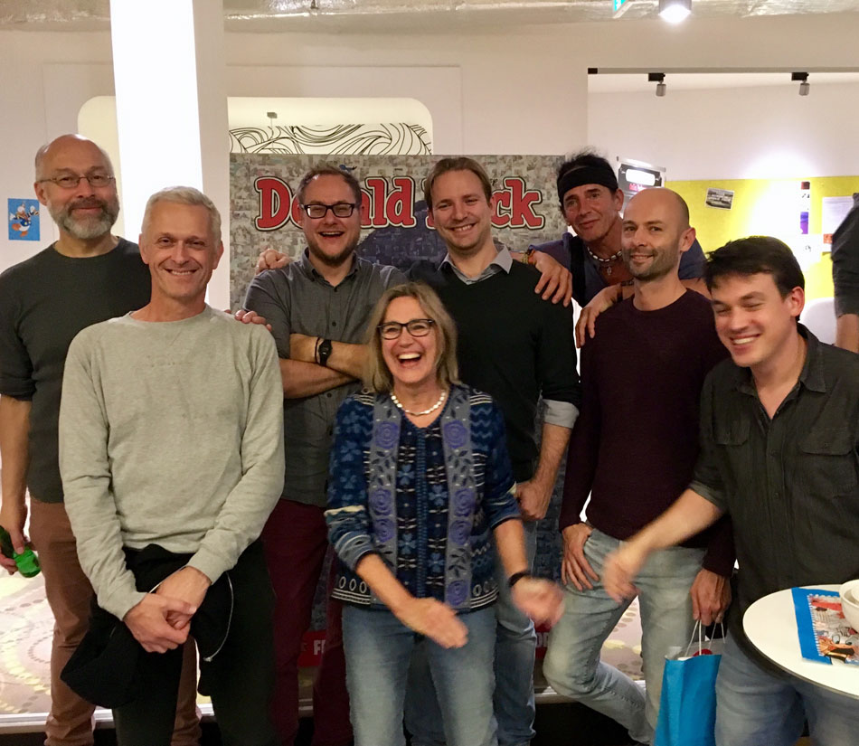 Part of the Dutch Donald Duck art team during the magazine's 65th anniversary in 2017: Frans Hasselaar, Michel Nadorp, Viktor Venema, Jan-Roman Pikula, Mau Heymans, Maarten Gerritsen and Tim Artz. Front and center: chief editor Joan Lommen.