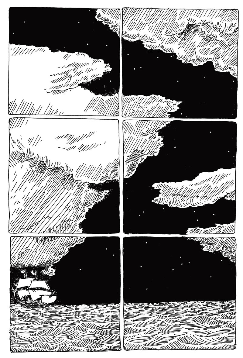 Gfrörer's next graphic novel, 'Black Is The Color' (2012) was initially serialized online on the Study Group Comics website and later made available in book format by Fantagraphics. The plot takes place in the 17th century, when two sailors are put in a lifeboat in the Strait of Magellan, because food supplies have run short. Out on the open sea, the sailor called Warren is soon the only survivor. Many scenes are slow on action, without much dialogue, to give a sense on how vast the ocean is and how lonely Warren is with his thoughts. One night, he is comforted by the mermaid Eulalia, who gives him new spirit and helps his mind drift away to more pleasant perspectives. To Warren, she is a friendly companion, even though what she presents to him are mere fantasies. Indeed, it's questionable whether she is even a benevolent spirit, as she asks him why he would want to stay alive, seeing that his existence hasn't been very fulfilling up to now. 'Black Is The Color' is named after an Appalachian folk song, once covered by Nina Simone.