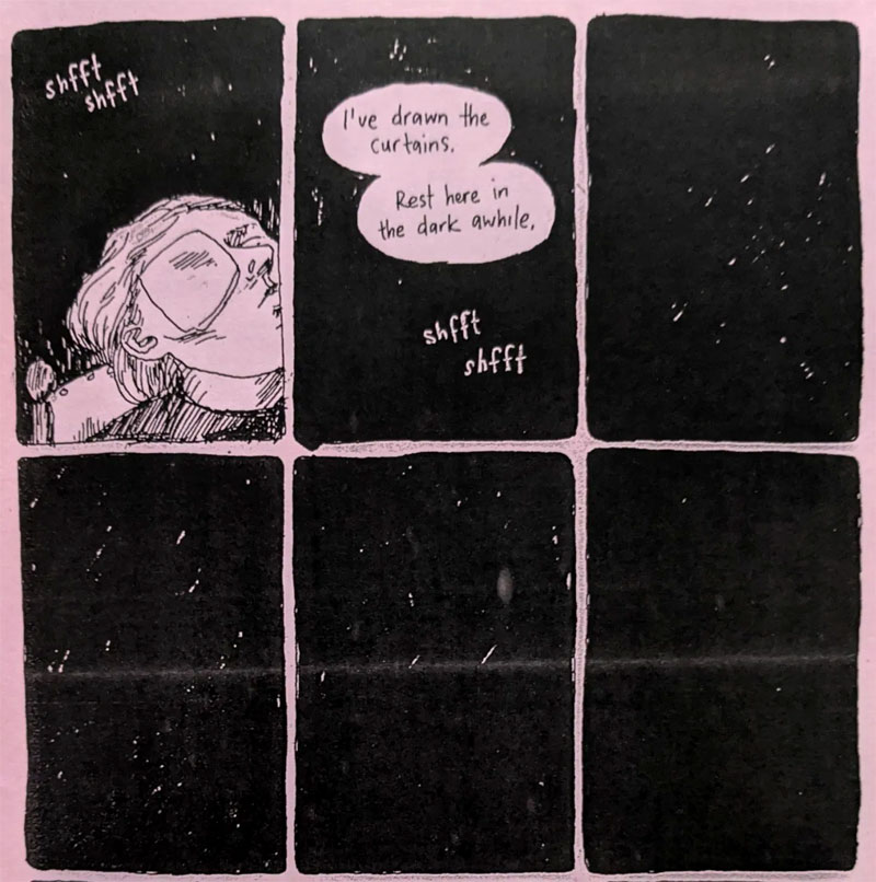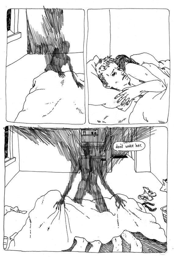 In her next mini-comic, 'Too Dark to See' (2011), Gfrörer further explored the theme of supernatural procreation. Mixing sex, darkness, coy humor and fairy tale elements, it tells the story of a mysterious feminine silhouette, a succubus, who visits a couple at night and forces the husband to have sex with her. The next morning he doesn't remember a thing, but he suddenly has a black growth, causing the young lovers' relationship to deteriorate.