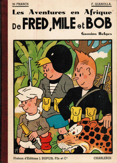 In 1932, however, 'Fred et Mile' returned to the pages of Mon Avenir, albeit drawn by Gianolla. He turned it into a genuine gag comic series. In 1936, a Dutch translation, 'Fred en Miel', ran in the Dutch-language version of Mon Avenir: "Onze Toekomst: Het Blad Dat Voorbereidt Tot Den Arbeid". Another child character, Bob, eventually became a main cast member, prompting a title change in 1938: 'Fred, Mile et Bob'. Now an adventure comic, it ran in other Catholic magazines like La Cité Nouvelle and L'Avant-Garde too. In 1939, 'Fred, Mile et Bob' also appeared in book format, published by Achille Faux in Charleroi. The second album of the series was one of the earliest comic book albums issued by Dupuis, the company responsible for Spirou magazine. It appeared in 1940 and had the very long title: 'Les Aventures en Afrique de Fred, Mile et Bob, Gamins Belges' ("Adventures in Africa of Fred, Mille and Bob, Belgian scoundrels"). A Dutch translation appeared too, only changing the characters' names to 'Jef, Dolfke en Rob, Rakkers Zonder Vaar of Vrees'. Gianolla's book was the first comic book published by Dupuis, the second was 'Les Aventures de Bibor et Tribar & Tif et Tondu' by Rob-Vel and Fernand Dineur, released in 1941. A third album of Gianolla's comic, 'Mousquetaires de 16 Ans', was released by SPES in 1954.