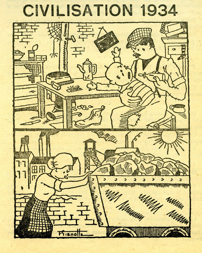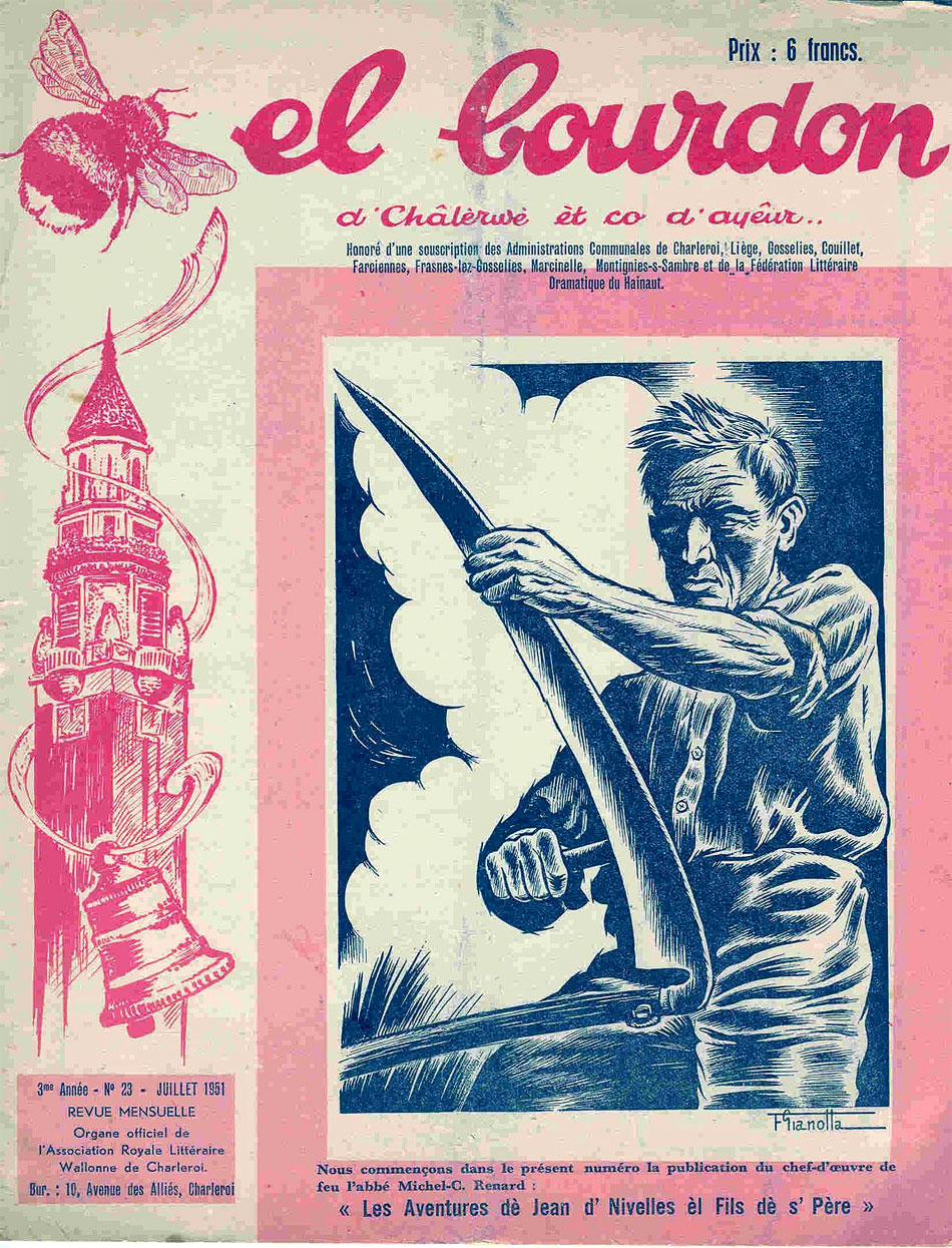 Gianolla also produced 'Les Pages du Roi Richard', which appeared at SPES publishers. He illustrated many posters for mass manifestations in a style resembling Frans Masereel. Shortly after World War II, he was an artist/cartoonist for the Katholieke Werkliedenbeweging (the Catholic worker's movement) and a Christian organization. Between 1946 and 1960, he spent most of his time between Paris, Switzerland and Charleroi, creating hundreds of cartoons for different papers and magazines, among them Le Soir Illustré. After settling in Charleroi, he became a friend of Félicien Barry, head of the Literary Association of the city, and became an illustrator for its monthly magazine El Bourdon. Gianolla also wrote various poems, plays, novels and songs in both French as well as Walloon dialect, all romanticizing the life of miners. His poems were collected in the book 'Sang du Pays Noir'.