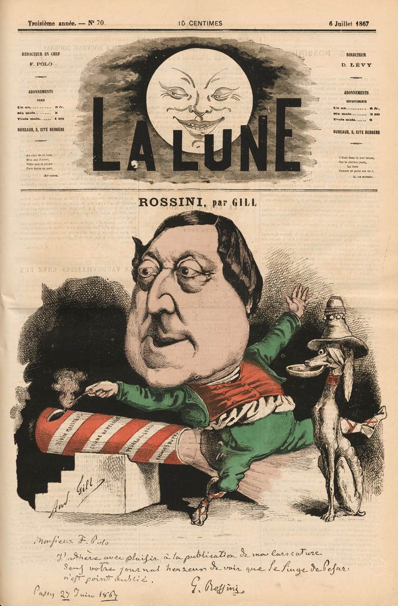 Cover drawings for La Lune of 16 December 1866 , caricaturing novelist Paul Féval, and 6 June 1867, caricaturing composer Gioacchino Rossini.