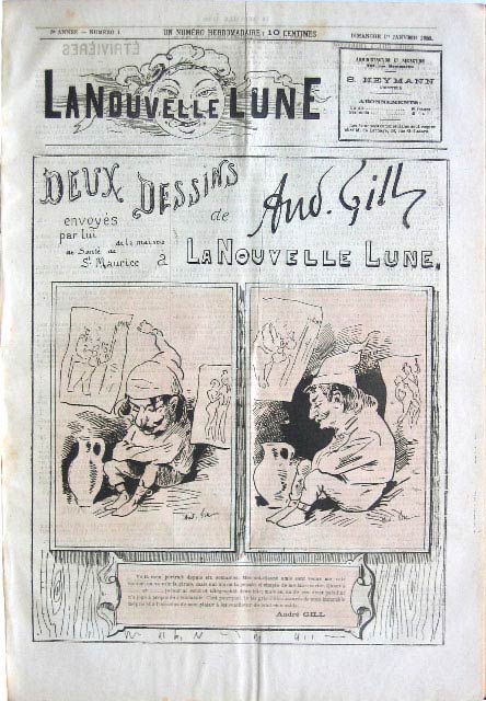 In 1882, Gill drew 'Deux Dessins' for the cover of La Nouvelle Lune, which portrayed the artist himself sleeping in his studio. The images are shown in two sequences, one showing him from the front, the other from the side. In 1883, he made a cover for La Nouvelle Lune titled 'Nouveaux Coquis', which depicts three images of his face with a date written underneath them. The first two are simple line drawings, while the third one is a more sketched out self-portrait. While not a comic strip, they can still be read as a thematic series of sequences.