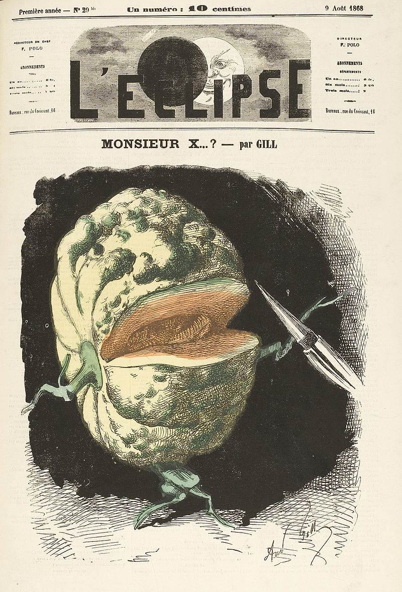 Polo established another satirical magazine, L'Éclipse, which quickly became Gill's new home publication. Yet only eight months later, on 9 August 1868, another of his cartoons sparked new public outrage. 'Monsieur X…?' (1868) depicted a pumpkin with a slice removed in which the face of a magistrate could be recognized. The issue was immediately restrained from circulation and Gill charged with the crime of "obscenity". He promptly wrote an open letter to the editor of Le Temps in which he claimed: "My drawings often had a mischievous intention, but never an obscene one. If L'Éclipse must be prosecuted, let it be for its actual intentions, not the ones attributed to it." During a court case, Gill managed to convince the jury that the charge was merely what others wanted to see in it. Nevertheless, L'Éclipse still had to pay a fine.