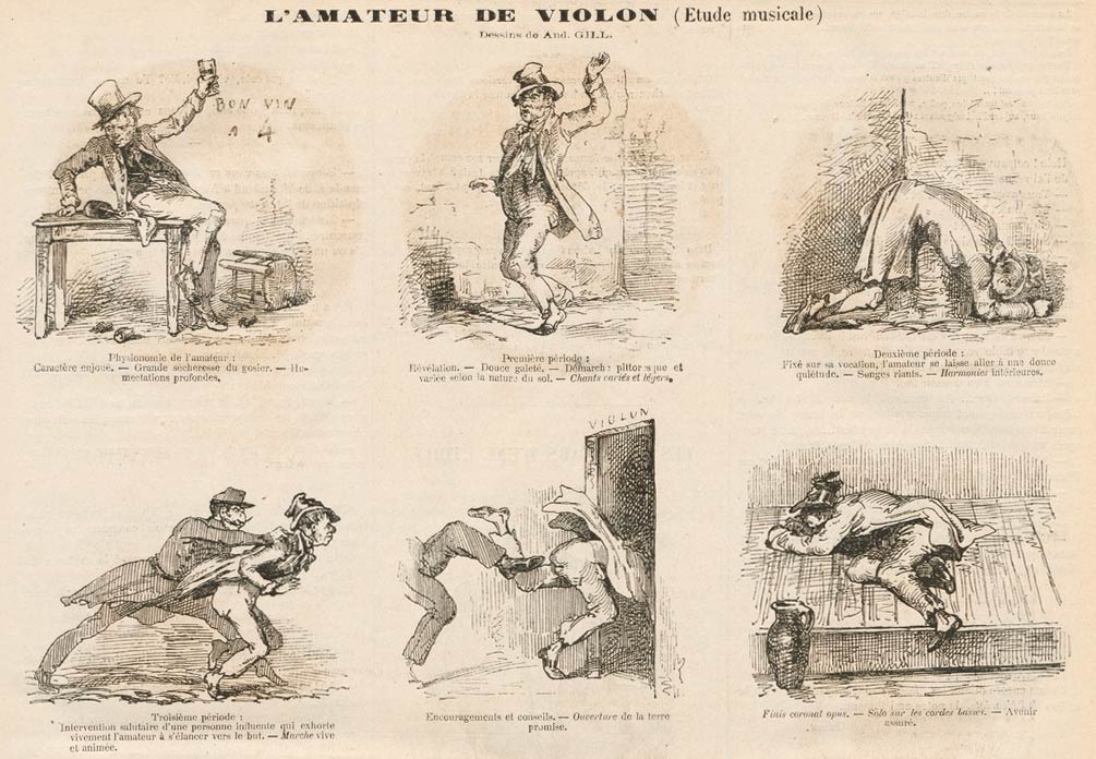 While Gill is first and foremost remembered as a caricaturist, he also made a contribution to comic history with a six-panel text comic named 'L' Amateur de Violon: Étude Musicale' ('The Amateur Violinist. Musical Study', 1866), published in La Lune. The story depicts a violinist who gets drunk and is eventually thrown in jail. Each moment of his low-life behavior is accompanied by sarcastic descriptions in the style of a violin movement, with the first image being called '1st Étude' and so on.