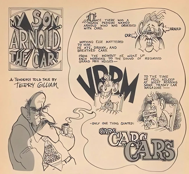 Gilliam also provided some comics to Petersen Publishing's magazines CARtoons and SURFtoons, for which Alex Toth also contributed work. In the October 1968 issue of CARtoons, Gilliam drew the comic story 'My Son Arnold, the Car', which already showed the absurdism and silliness he would later further develop in the Monty Python series. CARtoons #42 (August 1968) ran his story 'Like-New Spy For Sale!'