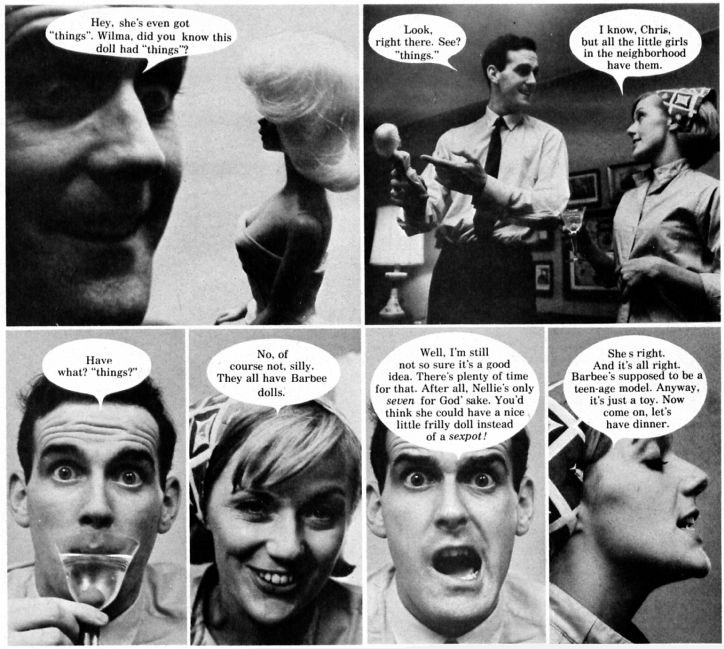 The best-known of Gilliam's comics for Help! was 'Christopher's Punctured Romance', which appeared in issue #24 (May 1965), co-written by Dave Crossley and photographed by Martin Iger. It stars a man falling in love with a Barbie doll. The actor in question was John Cleese, with whom he would later work together in Monty Python. In the final issue of Help! (issue #26, September 1965) Gilliam and Crossley also created the satirical pamphlet 'Buster, Have You Ever Stomped A Nigra?', which lampooned racism in the USA.