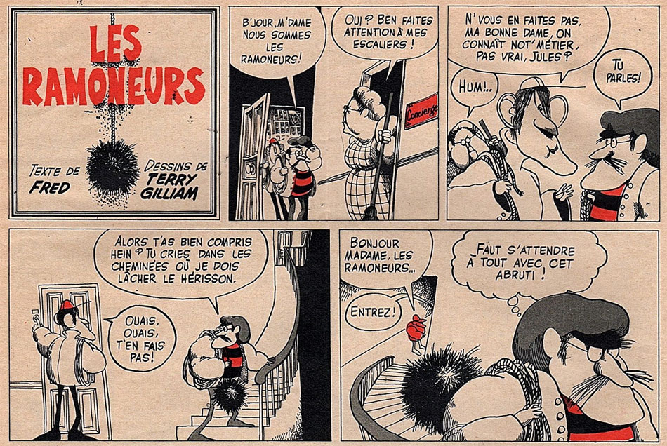 When Gilliam first came to Europe, he provided two short stories to the French magazine Pilote. In issue #331 (24 February 1966), he created a comic strip about a bunch of snowmen titled 'La Bonhomme de Neigeologie'. A year later he created 'Les Ramoneurs', written by Fred, which appeared in issue #426 (21 December 1967). The story revolves around a chimney sweep and a series of misunderstandings he causes among the residents of a flat.