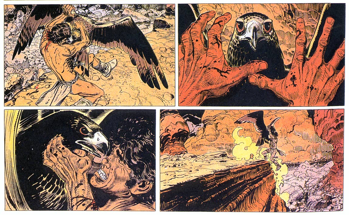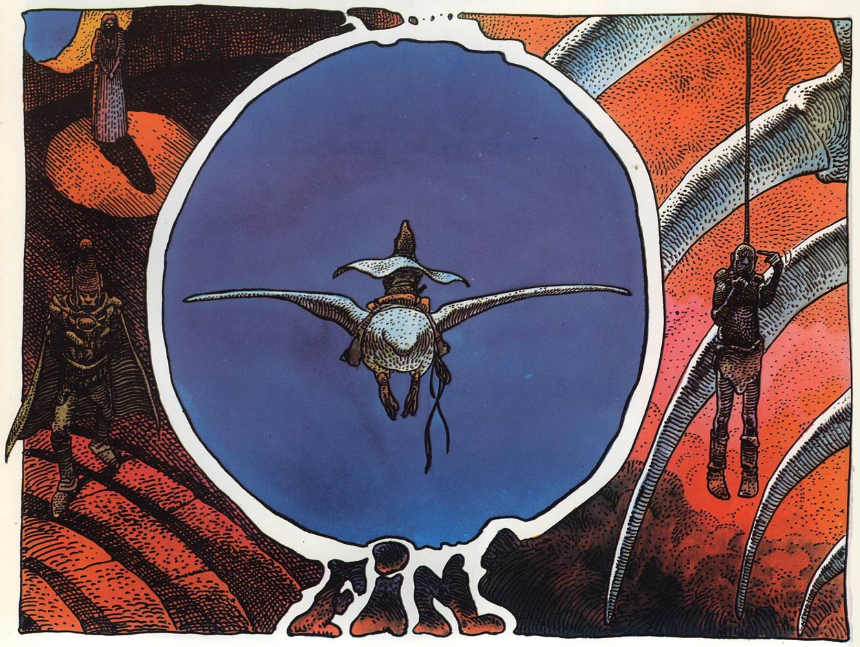 Moebius' talent for creating strange and desolate landscapes was showcased even more in 'Arzach', a collection of short comic stories about a silent warrior riding on a pterodactyl-like creature. The stories have no balloons, captions or onomatopoeia, which makes for a surreal and psychedelic reading experience. Even the main character's name seems disturbing, as Moebius spelled it differently in every story (Arzak, Arzach, Harzac, Harzach, Harzack). The installments appeared in Métal Hurlant between 1 April 1975 and 1 January 1976 and were collected in book format in 1976. Moebius returned to this character at the end of his life, when he planned to explore the character's origins in a trilogy. Only the first book was published under the title 'Arzak: L'Arpenteur' ('Arzak: The Surveyor') by Glénat in 2010. The second and third installments were never created due to the author's death in 2012.