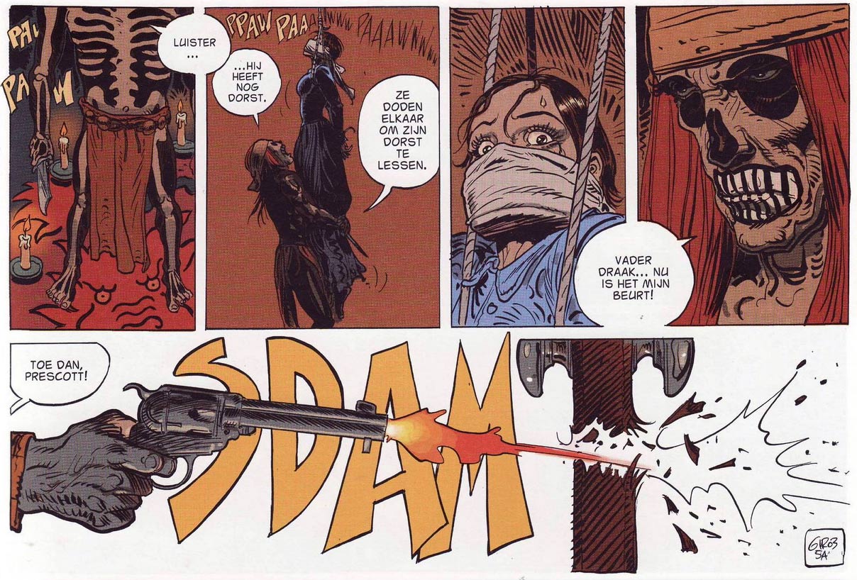 'Blueberry' gained full maturity when Giraud and Charlier made a story arc about a hidden treasure of Confederate gold in Mexico. This story arc consists of the albums 'Chihuahua Pearl' (1973), 'L'Homme Qui Valait 500.000 $' ('The Half-A-Million Dollar Man', 1973), 'Ballade Pour un Cercueil' ('Ballad For a Coffin', 1974), 'Le Hors-la-loi' ('The Outlaw', 1974) and 'Angel Face' (1975). The flawless hero of 'Fort Navajo' had now transformed into a normal, flawed human being, one who wasn't safe from being manipulated, betrayed and tortured. Giraud portrayed a less romanticized version of the Far West: dirty, sweaty and filled with people who toss morals overboard in order to survive in this harsh environment. This more exciting portrayal of the era appealed to readers who enjoyed spaghetti westerns in theaters and on TV and liked to read similarly-styled comics. 'Blueberry' therefore had a strong influence on several other, gritty European western comics, like 'Comanche' by Hermann and Greg, 'Jonathan Cartland' by Michel Blanc-Dumont, 'Durango' by Yves Swolfs and even the later 'Jerry Spring' stories by Giraud's former tutor, Jijé.