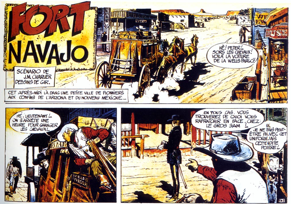 When scriptwriter Jean-Michel Charlier asked Jijé to create a new western series for Charlier's magazine Pilote, Jijé suggested Jean Giraud for the assignment. The first story, 'Fort Navajo', premiered in Pilote on 31 October 1963. The initial set-up featured an ensemble cast, but the character of Lieutenant Mike S. Donovan, A.K.A. Blueberry, quickly took center stage. Along the way, the rough but suave Blueberry acquired two sidekicks, namely the boozing gold prospector Jimmy McClure and Redneck, an expert on Indian matters. Dargaud, the original publisher of the books, continued to use the series title 'Fort Navajo, Une Aventure du Lieutenant Blueberry' until 1973, when the series continued to appear under the ‘Blueberry’ banner.