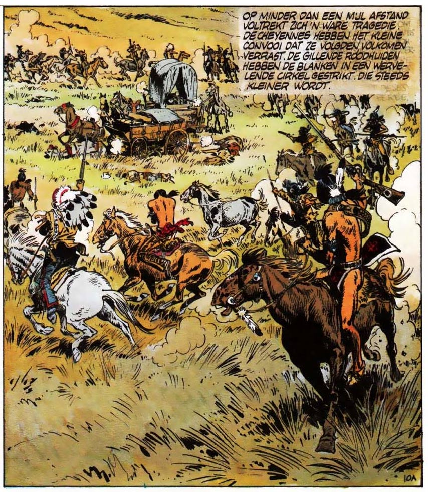 The first 'Blueberry' cycle dealt with the American Indian Wars, and consisted of more basic adventure stories in the tradition of Charlier's other series, such as 'Buck Danny', 'La Patrouille des Castors' and 'Barbe-Rouge'. Giraud based Blueberry's original looks on the French western actor Jean-Paul Belmondo, while his artwork in general was still heavily inspired by Jijé. As the series evolved, Giraud became more and more influenced by the gritty western movies of Sergio Leone, Sergio Corbucci and Sam Peckinpah, American comic artists Milton Caniff and Hal Foster, and Western painter Frederic Remington. Giraud's brushwork became grittier too, and his involvement in Charlier's scripts increased. To heighten the realism, Blueberry also aged as the stories progressed, a highly unusual practice for adventure comics at the time. When Pilote started to focus more on mature readers from 1968 on, Giraud was able to give 'Blueberry' a more hard-boiled atmosphere.