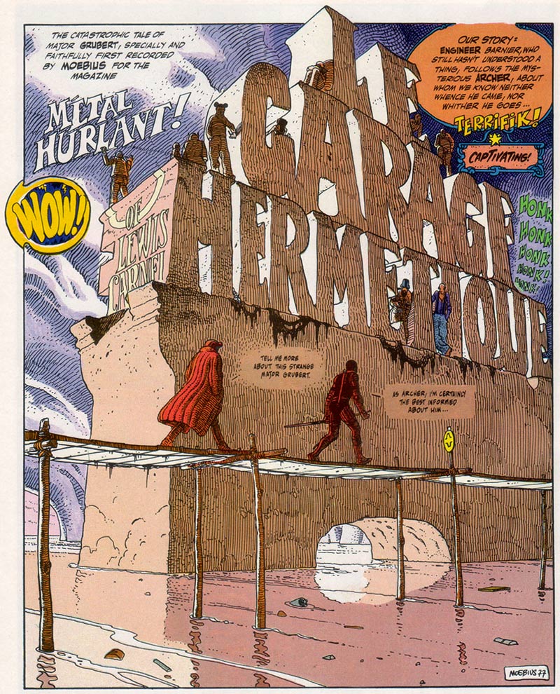 Moebius experimented with every aspect of the comics medium. He switched from drawing with a brush to a pen, which resulted in more open drawings with influences from the "Clear Line" style. He crafted highly imaginative worlds and creatures, while his narratives are mainly based around improvisation and character development instead of plot. An essential character in Moebius' output is Major Grubert, a traditionally outfitted explorer inspired by Frank M. Buck's 1930 novel 'Bring 'm Back Alive'. The character had first appeared in a short story for Pilote, and then in experimental and surreal stories for France-Soir and Fluide Glacial. He was also instrumental in one of Moebius' masterpieces, 'Le Garage Hermétique' ('The Airtight Garage', 1976-1979). In this series of often confusing short stories, Major Grubert encounters several entities seeking to invade an asteroid in a pocket universe. Another notable character is Jerry Cornelius, a secret agent created by sci-fi and fantasy author Michael Moorcock as a sort of "open source" character for other authors to work with.