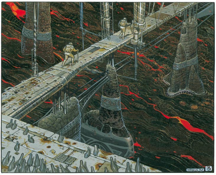 Besides the abandoned 'Dune' project, Jean Giraud/Moebius has participated in the development of several movies. He did storyboards and concept designs for Ridley Scott's movie 'Alien' (1977), 'Tron' (1982) by The Walt Disney Company, René Laloux's 'Les Maîtres du Temps' ('Time Masters', 1982), James Cameron's 'The Abyss' (1989) and Luc Besson's 'The Fifth Element' (1997). A comic album with stills from 'Les Maîtres du Temps' and a companion book with storyboard drawings and photos were published by Les Humanoïdes Associés in 1982.