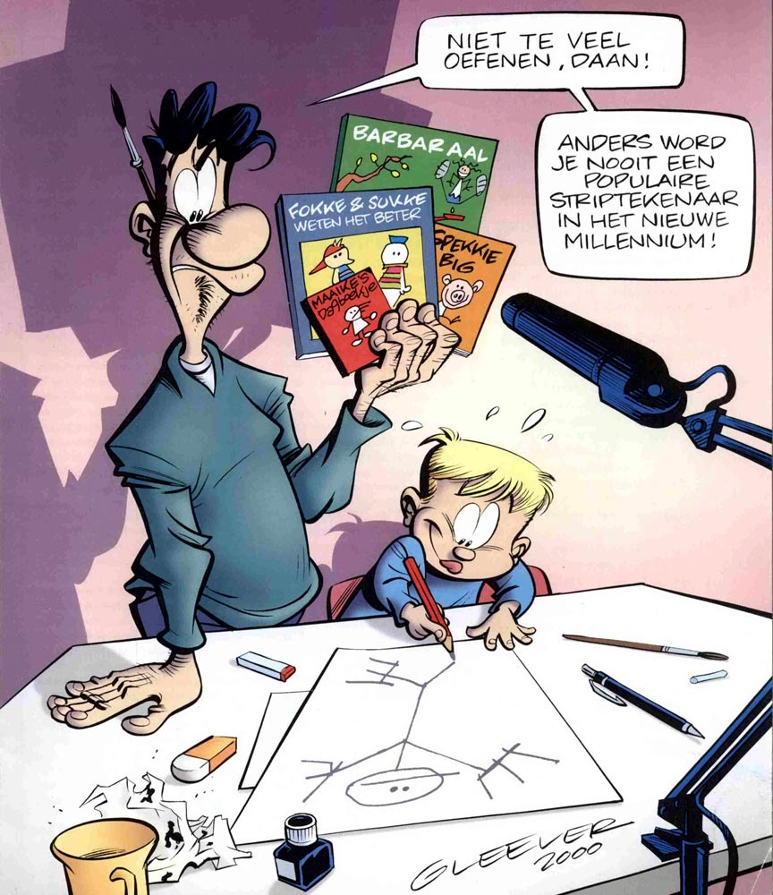 'Gleever's Dagboek', 2000. Translation: "Don't practice too much, Daan, otherwise you'll never become a popular comic artist in the new millennium."