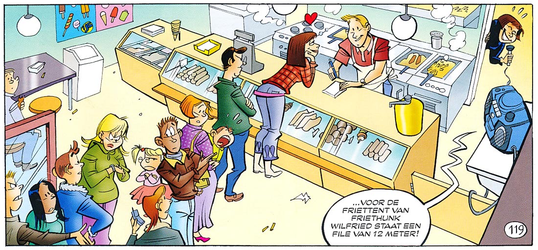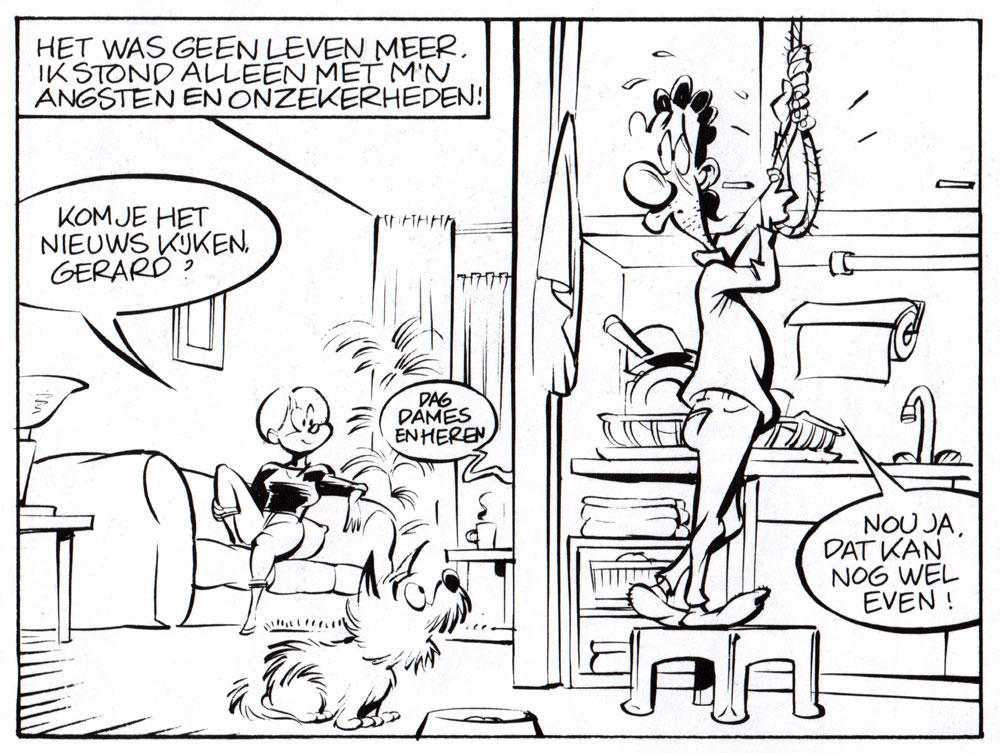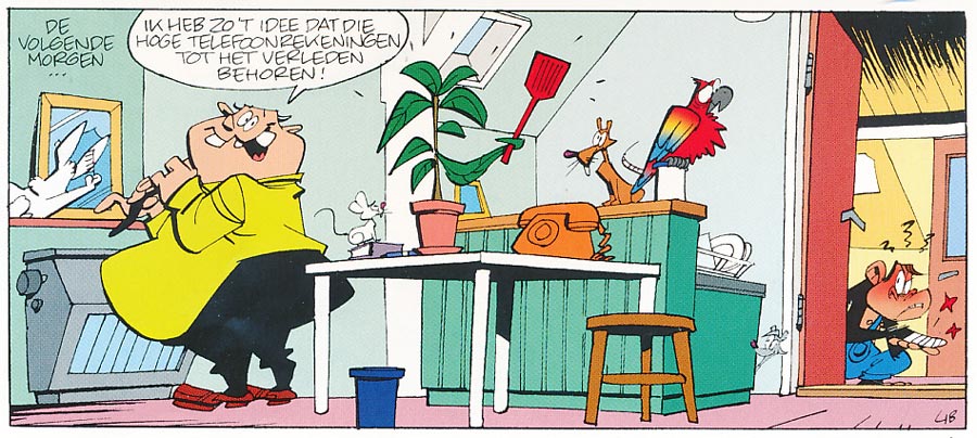 In an overview of Gleever's impressive comics oeuvre, the role of his wife and colorist Wilma Leenders should not be overlooked. A former student of fashion design, she forms an essential part of Gerard Leever's comics production since their first meeting in 1983. Besides coloring all of his pages, she naturally also has a prominent role in his diary comics. Wilma has established herself as one of the leading comic colorists of the Netherlands. She has colored many comics in the magazines Eppo/Wordt Vervolgd and Sjors en Sjimmie Stripblad, and is since many years the colorist of the front and back cover of Donald Duck weekly. Many comics by Hanco Kolk and Peter de Wit were treated with her coloring skills, including 'Gilles de Geus', 'De Familie Fortuin' and 'S1ngle'. She was also the regular colorist of Aloys Oosterwijk's 'Willems Wereld', Charel Cambré's 'Amoras' and 'Jan, Jans en de Kinderen' by Studio Jan Kruis.