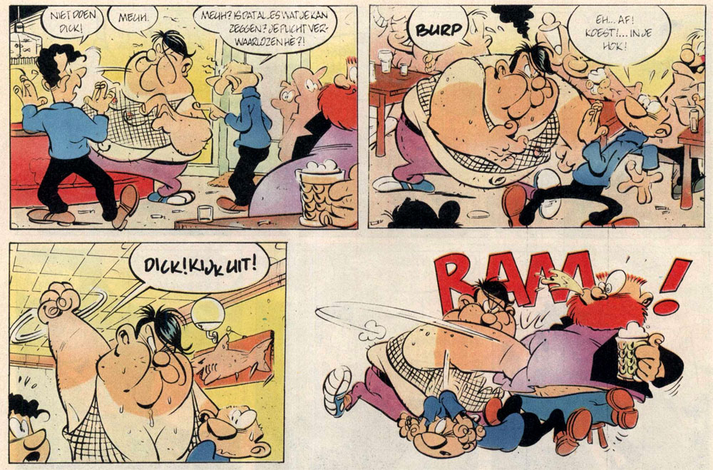 With fellow studio members Hanco Kolk and René Meulenbroek, Gleever created the humorous comic 'Ernst Vrolijk en Dick Hout', starting in issue #2430 (8 November 1984) of Robbedoes, the Flemish edition of Spirou. At the time, Robbedoes offered more room for Dutch and Flemish comic authors. 'Ernst Vrolijk en Dick Hout' is set in a two-man employment agency, where the proprietors take all kinds of wacky assignments. Ernst Vrolijk is the black haired one and generally straight, timid and unsure. His name is a pun on the contrast between Dutch words "ernst" ("seriousness") and "vrolijk" ("happy"). Dick Hout is the bald one who always takes the initiative, though often puts the duo in more risky situations than they could foresee. His name is a pun on the word "dik hout" ("big wood") and the expression "van dik hout zaagt men planken" (used in situations where things are taken care of in an efficient but crude manner). Although a studio effort, 'Ernst Vrolijk & Dick Hout' had a clear separation of each individual task. Kolk wrote the stories, while Gleever provided the artwork for the characters and René Meulenbroek drew the backgrounds. A total of four stories were produced, but only three appeared in Robbedoes.
