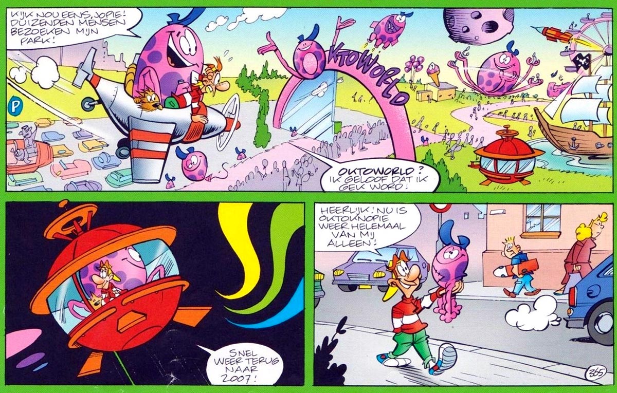 1985 was a productive year for Gleever, as he also created one of the most defining characters of his career for Malmberg's school magazine Taptoe. On 15 September 1985, the first episode of his signature gag comic 'Oktoknopie' appeared in this magazine. The comic centers on a young boy, Jopie, who owns a sentient octopus toy named Oktoknopie. When he and Jopie are alone, Oktoknopie becomes alive and grows to enormous size. He is not only Jopie's friend and confidant, but also has magic powers which enable him to fulfill several of Jopie's wishes and solve problems. Oktoknopie, for instance, has a time machine. In most episodes, other people seem unaware that the doll is alive. In others, Oktoknopie changes reality to such a degree that even Jopie's parents, teachers and friends seem to realize something. Interestingly enough, 'Oktoknopie' debuted only a few months before 18 November 1985, when a similar newspaper comic about a boy and his sentient doll debuted in the USA: Bill Watterson's 'Calvin and Hobbes'.