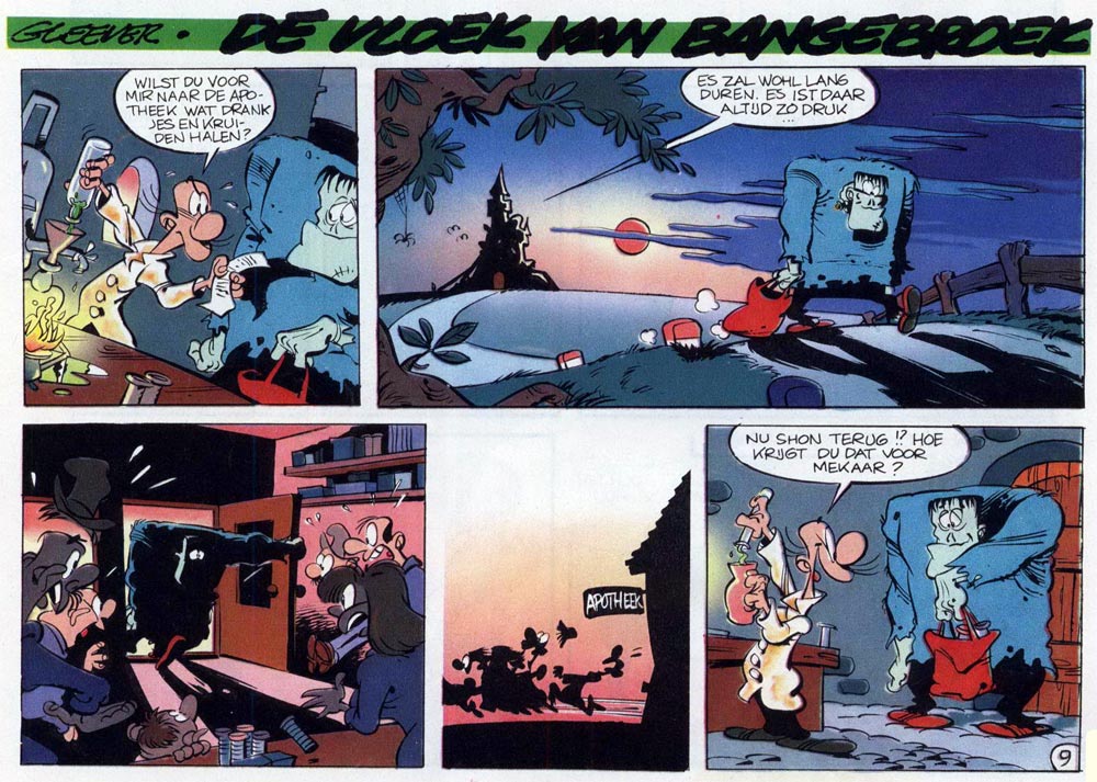 In Robbedoes, Leever also launched his first solo comic series, 'De Vloek van Bangebroek' (1984-1985). Originally based on a concept for a newspaper comic by René Meulenbroek, Gleever took the feature to his own hand and developed it into a funny gag strip about a village inhabited by vampires, monsters and zombies. By 2008 and 2009, Gleever made new episodes of 'De Vloek van Bangebroek' for Jetix Magazine. In 2008, the series appeared in book format as 'Mon Ami, Le Monstre' (French) and 'The Curse of Yellowville' (English) in the educational Leesleeuw collection of the publishing house Zwijsen. Two Dutch-language album collections were published by Strip2000 in 2014.