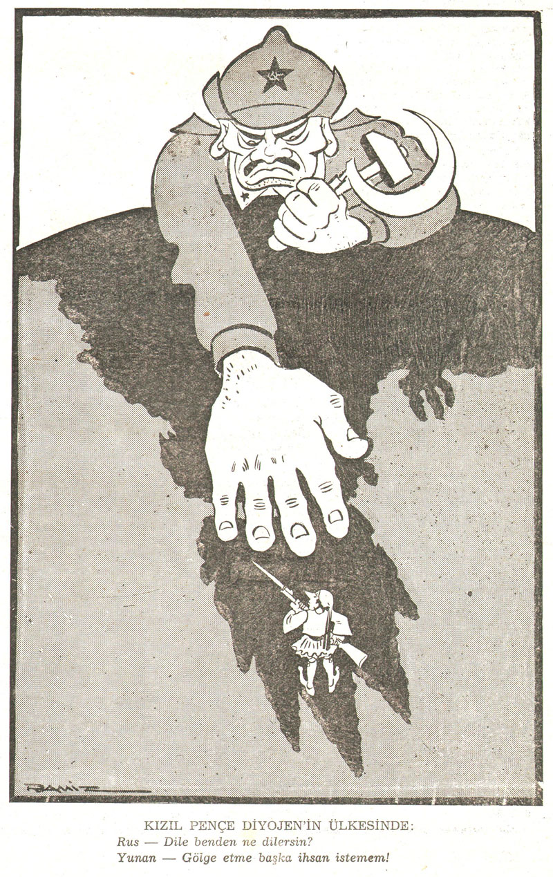 Cartoon from Mizah #57. The Russian soldier asks: "Ask me what you want!", whereupon the Greek replies: "Don't overshadow me, I want other favors!".