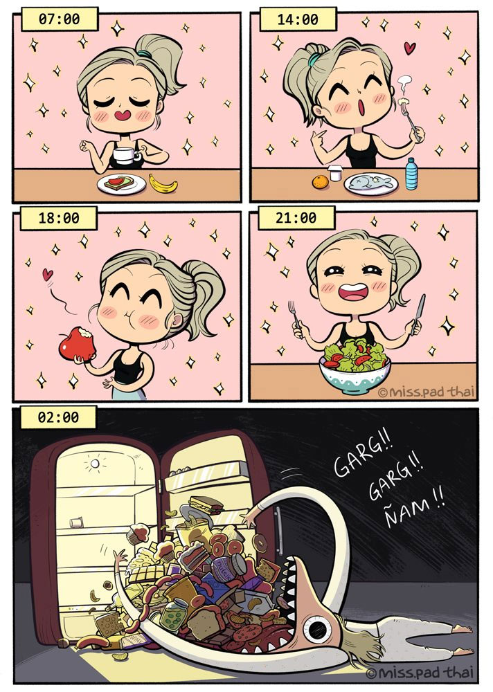 In her spare time, González gives intimate and humorous insights into her everyday life through her webcomic 'Miss Pad Thai' (2017- ), the title based on a nickname the artist was given while visiting Thailand. Sharing the more awkward moments in the life of a young woman in one to four-panel strips on her social media accounts, more than 100K followers have discovered instant recognizability in her work. With her self-aware and spicy humor, she makes comic strips about living with her boyfriend, the loud and drunken shamelessness of a girls' night out and the more cringeworthy moments of everyday life. In her "expectations versus reality" cartoons, she humorously tackles subjects like self-esteem and human imperfection with honesty and self-mockery.