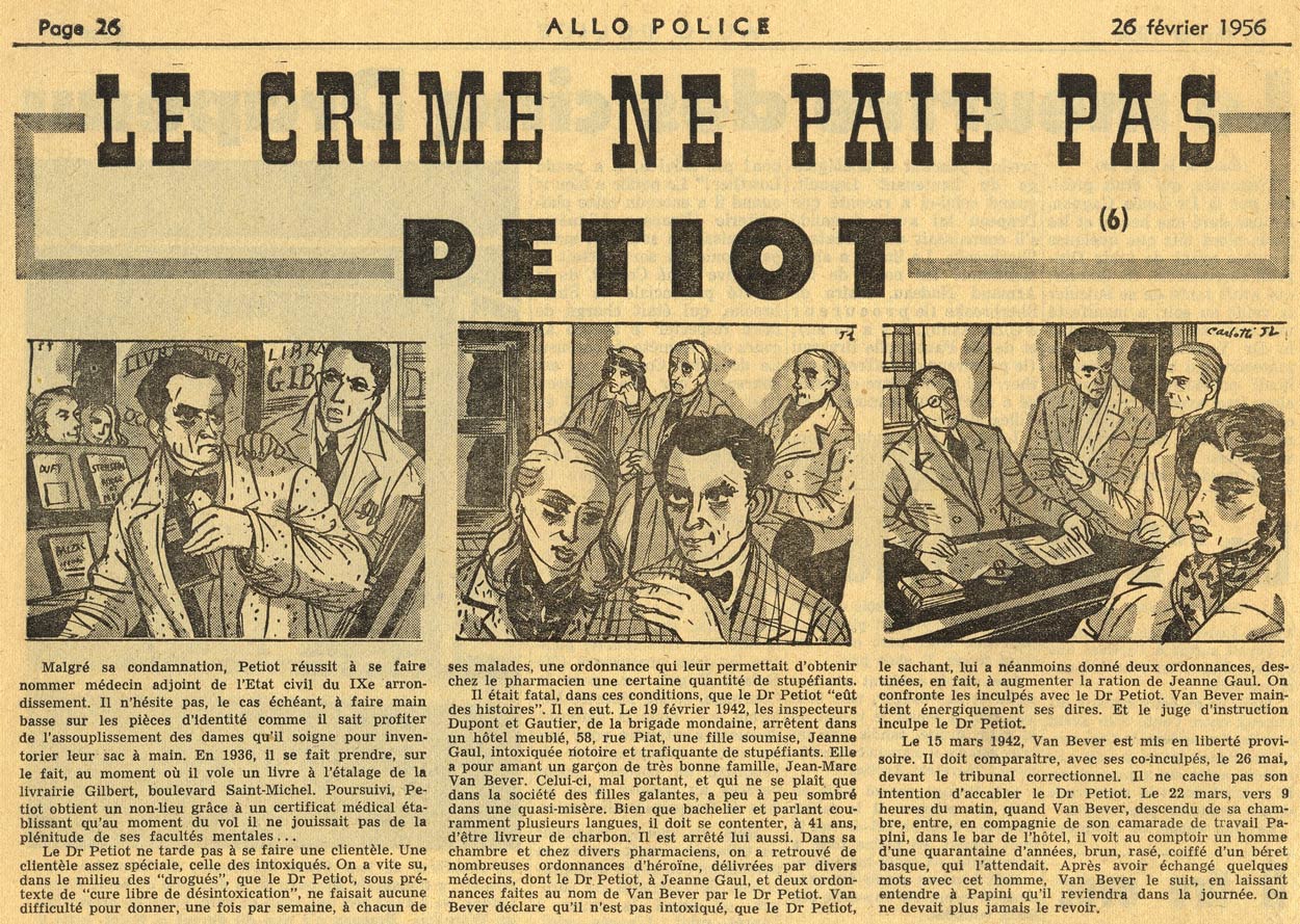 The vertical strips were sometimes edited to horizontal strips when they were syndicated to other publications (artwork by Jean Albert Carlotti). This 26 February 1956 episode comments on infamous French serial killer Marcel Petiot (1897-1946).