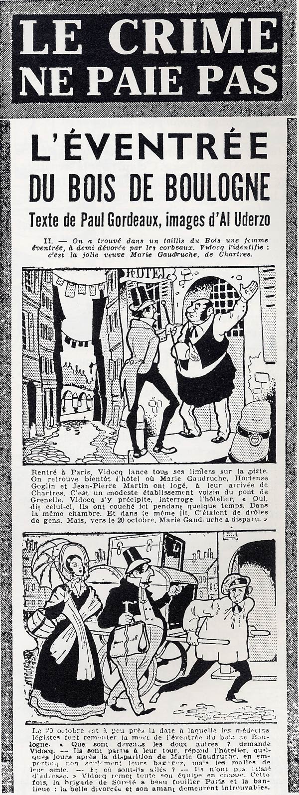 Launched on 16 November 1949, one of the features created by Paul Gordeaux was 'Le Crime Ne Paie Pas' ("Crime Does Not Pay"), a series of true crime cases, told in a text comics format. The strip shares its theme and name with the American comic book 'Crime Does Not Pay' (Lev Gleason, 1942-1955), for which Charles Biro was the main artist. Gordeaux documented the subjects and wrote the informative text captions of 'Le Crime Ne Paie Pas'. Several top illustrators of the time were assigned to provide the artwork. The first was Jean Bellus, and in the next couple of decades he was followed by Jean Ache, Regino Bernad, Jacques-Armand Cardon, Jean-Albert Carlotti, Roger Chancel, Bernard Duc, Jean Effel, Gorce, Jacques Grange, Étienne Lage, Jacques Lechantre, Jean Lenoir, William Francis Marshall, Mant, Louis Moles, Jacques Pecnard, Charles Popineau, Jean Randier, Jean Reschofsky, Andreas Rosenberg, Jacques Taillefer, and even Albert Uderzo, the future artist of 'Astérix'. About 300 crime stories were covered in about 6,200 daily strips.