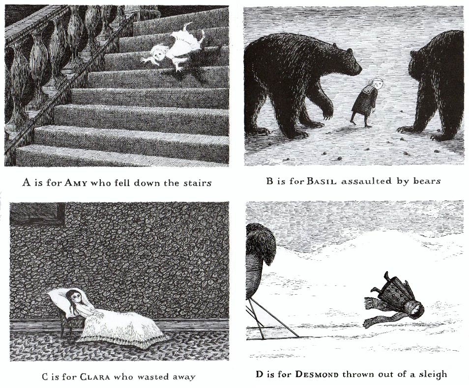 Gorey himself classified his work as "nonsense literature". The surreal horror is often juxtaposed with black comedy, described in such dry narration that some audiences find it hilarious, rather than frightening. In the previously mentioned 'Bug Book', for instance, the bugs put the flattened corpse of the bullying bug inside an envelope and address it to "whom it may concern". Afterwards they have a party "and everyone enjoyed himself immensly." Some of the children's deaths in 'The Gashlycrumb Tinies' are plausible, others quite far-fetched, like "being assaulted by bears", to downright silly, like little Neville who "dies of boredom." In 'The Hapless Child', the father of little Charlotte Sophia looks for his long lost daughter. Just when they seem to have a happy reunion, he accidentally runs her over with his buggy! Although Gorey is associated with macabre, sometimes bizarre children's stories, some of his books are more straightforward and family friendly, like 'The Wuggly Ump' (1963), in which a group of children discover a strange creature named The Wuggly Ump. Overall, Gorey was an eccentric creative soul, who enjoyed putting his personal pet peeves in all his stories, namely ballet, fur coats, tennis shoes and cats.